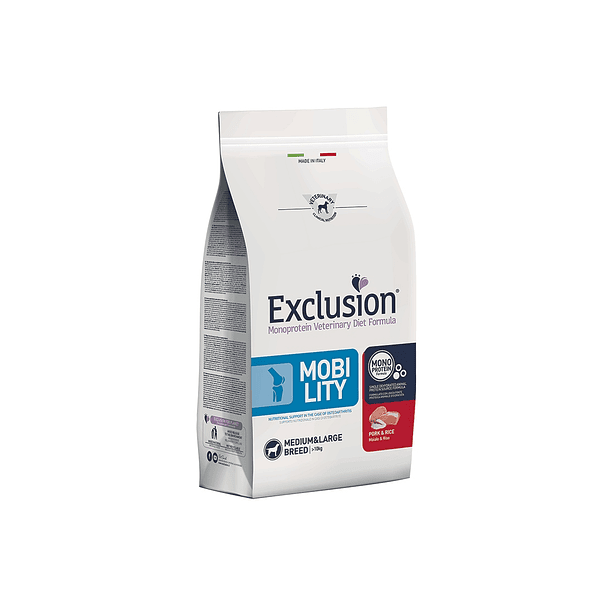 Exclusion Monoprotein Veterinary Diet Formula Mobility é um alimento dietético com formulação monoproteíca, feito com uma única fonte alternativa de proteínas animais, ingredientes inovadores e preservados com tocoferóis naturais; representa a resposta nutricional à disposição do médico veterinário, diferenciada por tamanho, como suporte nutricional para promover a mobilidade articular.